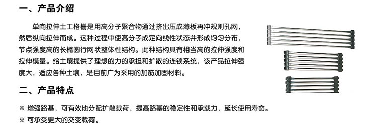 單向拉伸的土工格柵是由高分子聚合物經(jīng)擠出壓成薄板再?zèng)_規(guī)則孔網(wǎng),然后縱向拉伸而成。這種過程中使高分子成定向線性狀態(tài)并形成分布均勻、節(jié)點(diǎn)強(qiáng)度高的長 橢圓形網(wǎng)狀整體性結(jié)構(gòu)。此種結(jié)構(gòu)具有相當(dāng)高的拉伸強(qiáng)度和拉伸模量,特別是我公司此類產(chǎn)品更具有超國際水平的高早期(伸長率在2%—5%)拉伸強(qiáng)度和拉伸模 量。給土壤提供了理想的力的承擔(dān)和擴(kuò)散的連鎖系統(tǒng)。該產(chǎn)品拉伸強(qiáng)度大(>150Mpa),適應(yīng)各種土壤,是目前廣為采用的加筋加固材料。