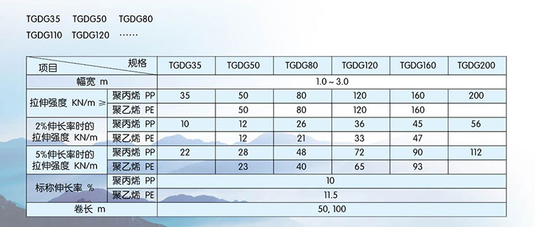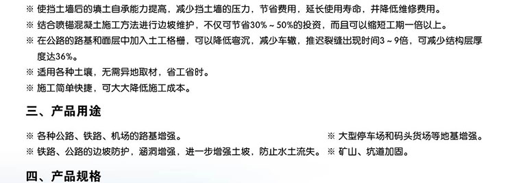 該產(chǎn)品適用于修建公路、鐵路以及江河湖海岸邊的加筋檔土墻、堤壩、橋面、陡坡及土工格室等工程。其作用是可提土墻或堤壩的承載力,延長使用壽命,減少占地面積,縮短工期,降低造價(jià),減小維修費(fèi)用。